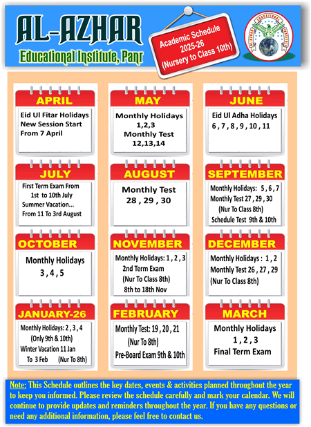 جماعت نرسری سے جماعت نہم تک کے فرسٹ ٹرم کے نتائج اور جماعت دہم کے ماہانہ ٹیسٹ کے نتائج ویب سائٹ پر ملاحظہ کیے جا سکتے ہیں۔
